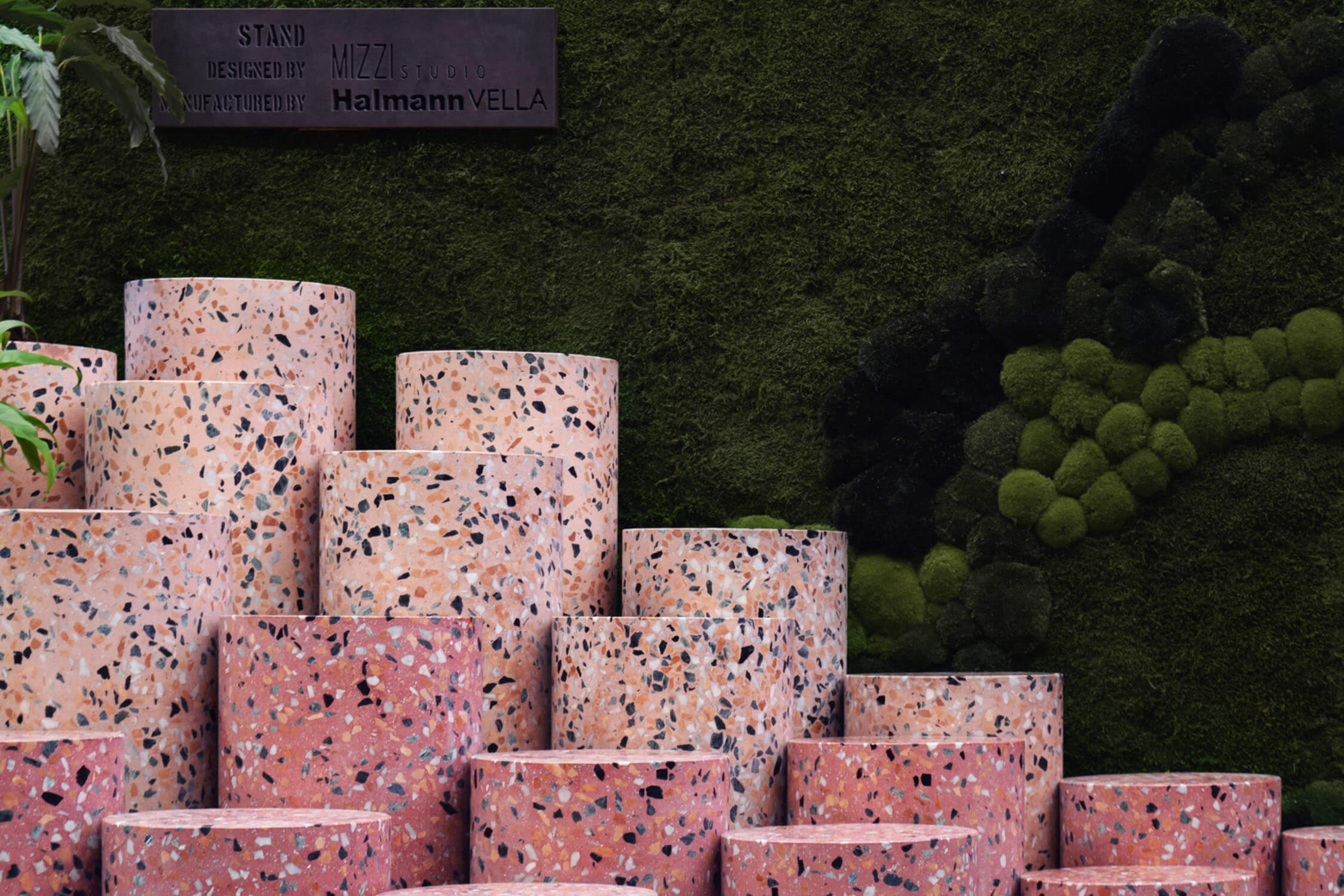The display featured a series of incrementally heighted terrazzo columns, with a colour scheme drawing on colour trends that are still dominant in today’s design and architectural world.
