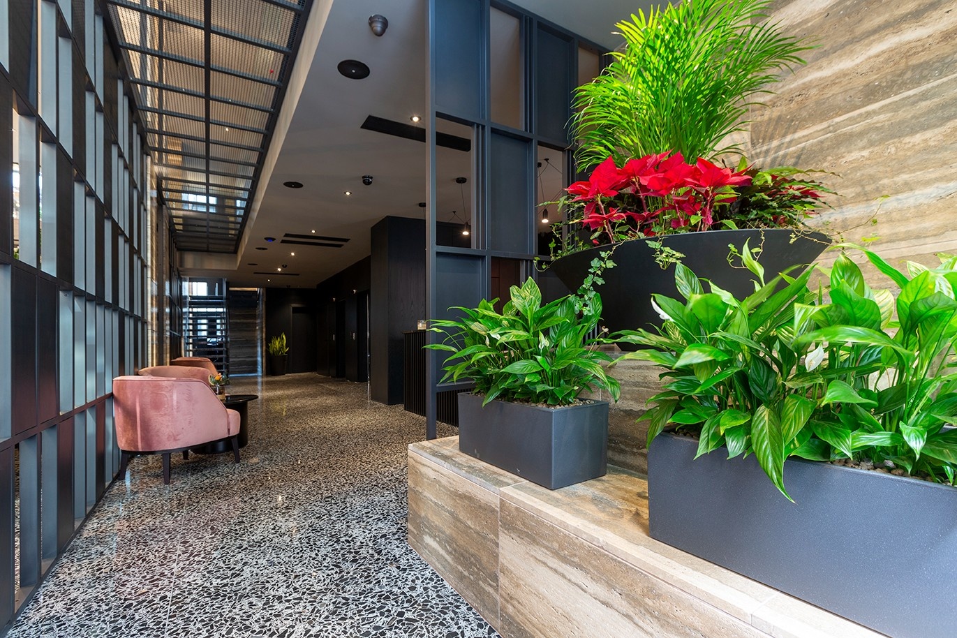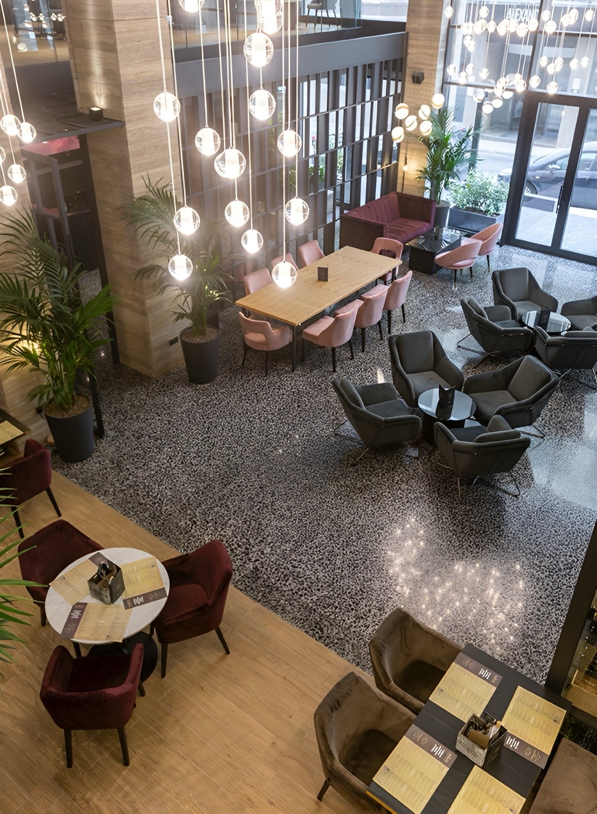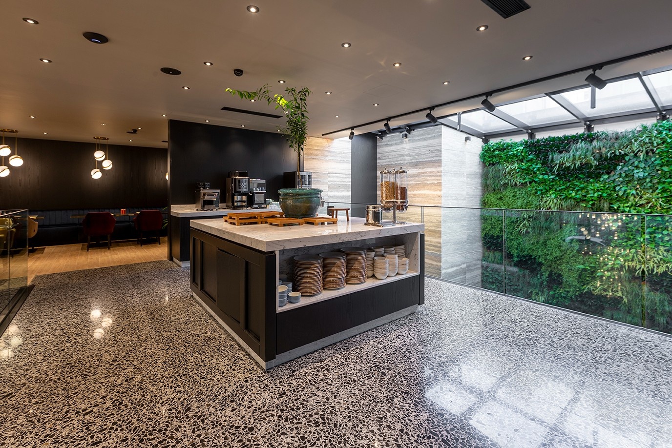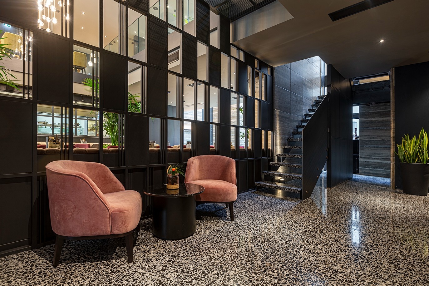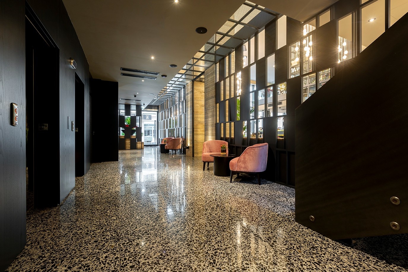 The Urban hotel is a fusion of contemporary and urban deco, located in the heart of St Julian’s. The ‘Urban’ terrazzo mix from the ‘Minima’ Collection was chosen to furnish the floors at the entrance, circulation spaces and staircase cores. Flooring was cut in standard 1200 x 1200mm format and stairs were detailed in a straight edge 30mm thick threads and risers in a brushed finish.